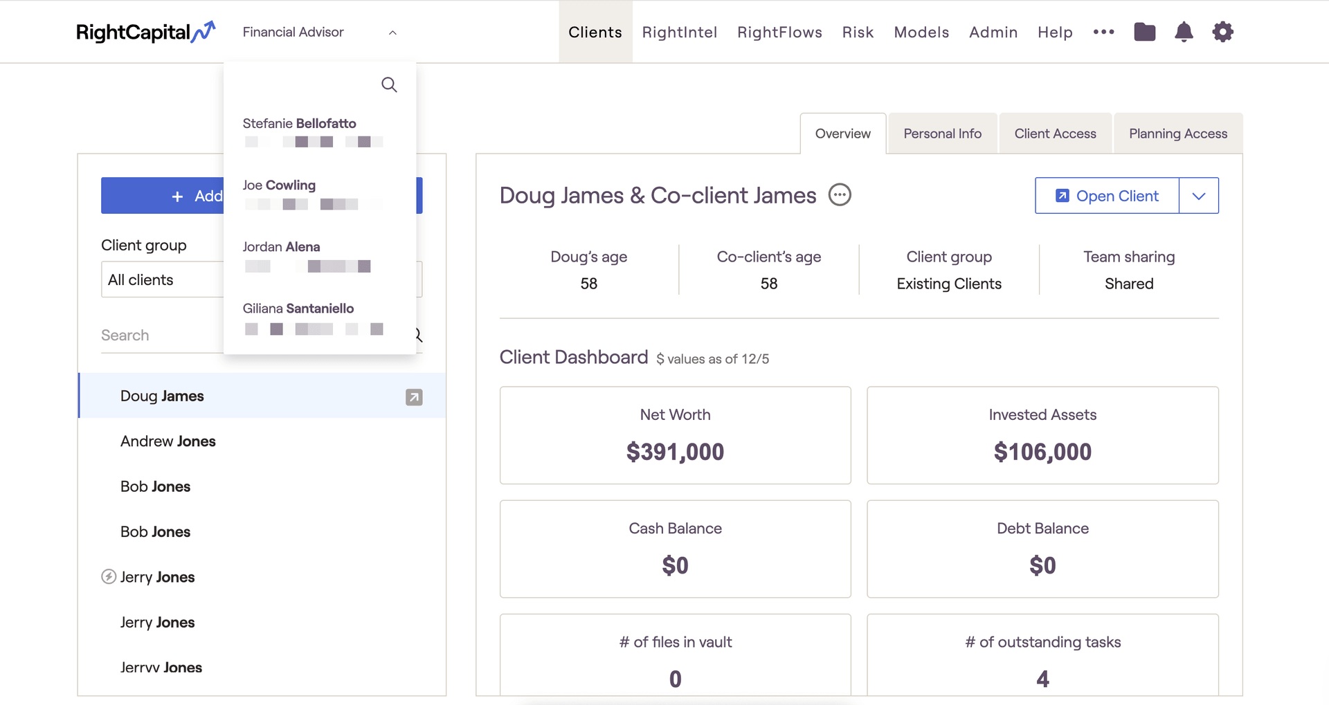 The Team Collaboration feature connects advisors working in the same firm, allowing them to view, edit and present financial plans created under affiliated advisors. This setting is available, upon request, for advisors who work together and hold Platinum subscriptions to RightCapital.
