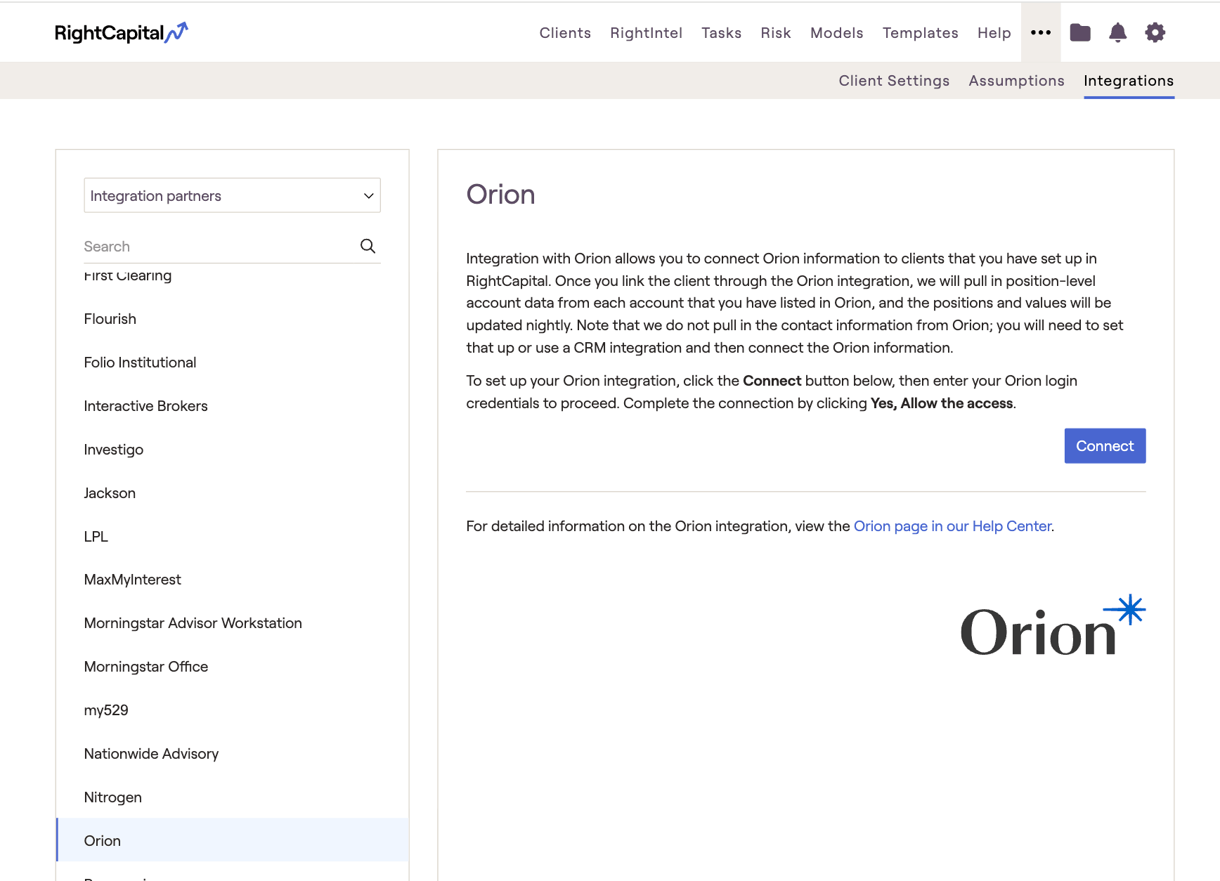 Integrating with Orion connects client information from Orion to the financial plan in RightCapital. Once linked, RightCapital pulls in position-level account data from each account and connects them with the client's net worth. The positions and values will be updated Tuesday through Saturday evening with the previous night's closing value.