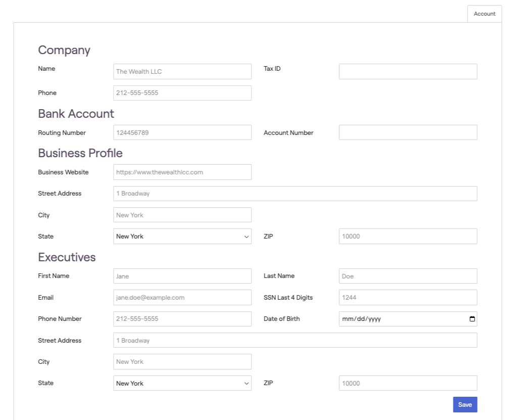 You will need to fill out all information on the Accounts screen to create your account. It is important to enter accurate information as it is submitted to and reviewed by the payment processor, Stripe.