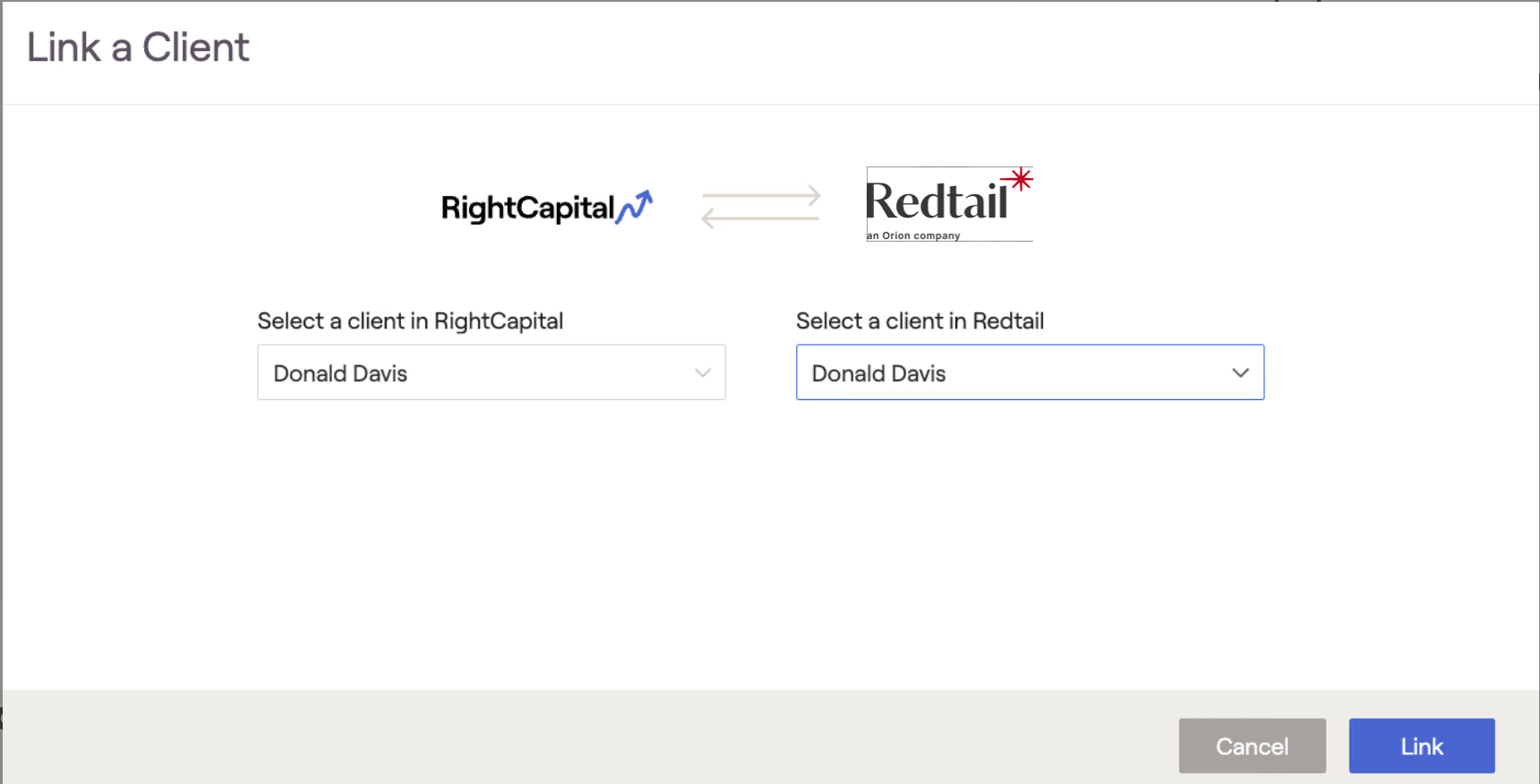 Select the client in RightCapital from the dropdown menu, then enter the last name of the corresponding Redtail contact. Once both names are selected, click the blue Link button. This will link the clients, but no contact data will be overwritten until the client is manually synced from the Manage Clients page.