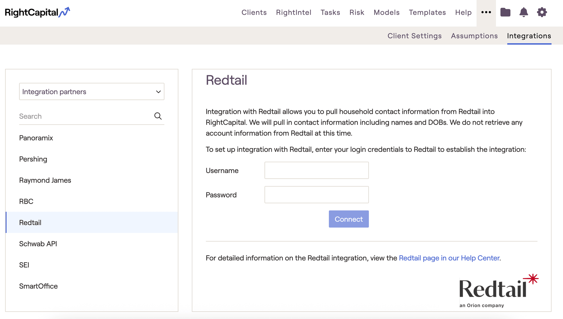 Integrating with Redtail allows household contact information from Redtail to sync into RightCapital. Contact information, including names and date of birth, will be connected. At this time RightCapital does not retrieve any account information from Redtail. For information on using the single sign-on into Redtail from RightCapital click here.