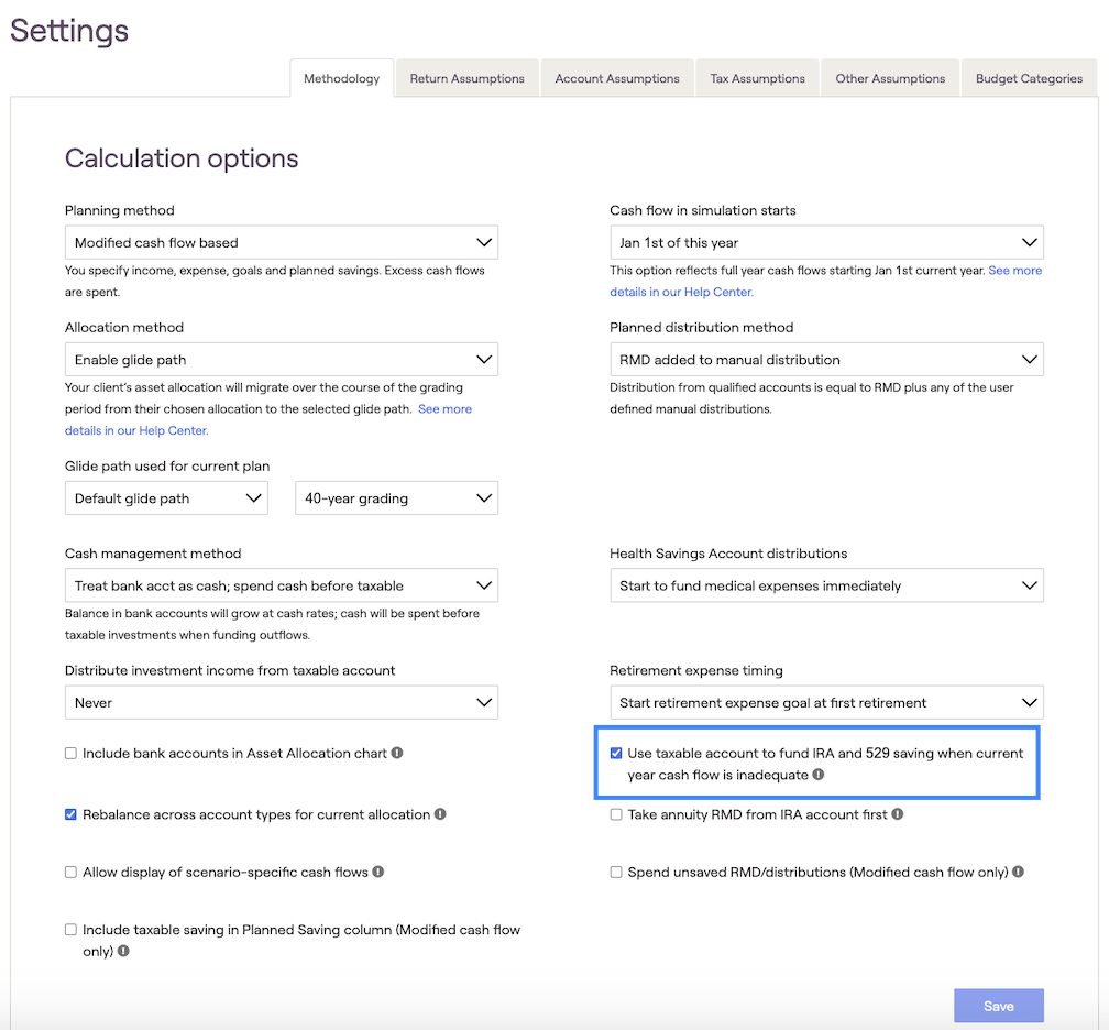 To change the Planning Method to "Cash Flow" or "Modified Cash Flow" this can be changed in the Gear icon > Settings > Methodology tab within the client plan. To learn more about the planning methods that RightCapital offers, please click here.