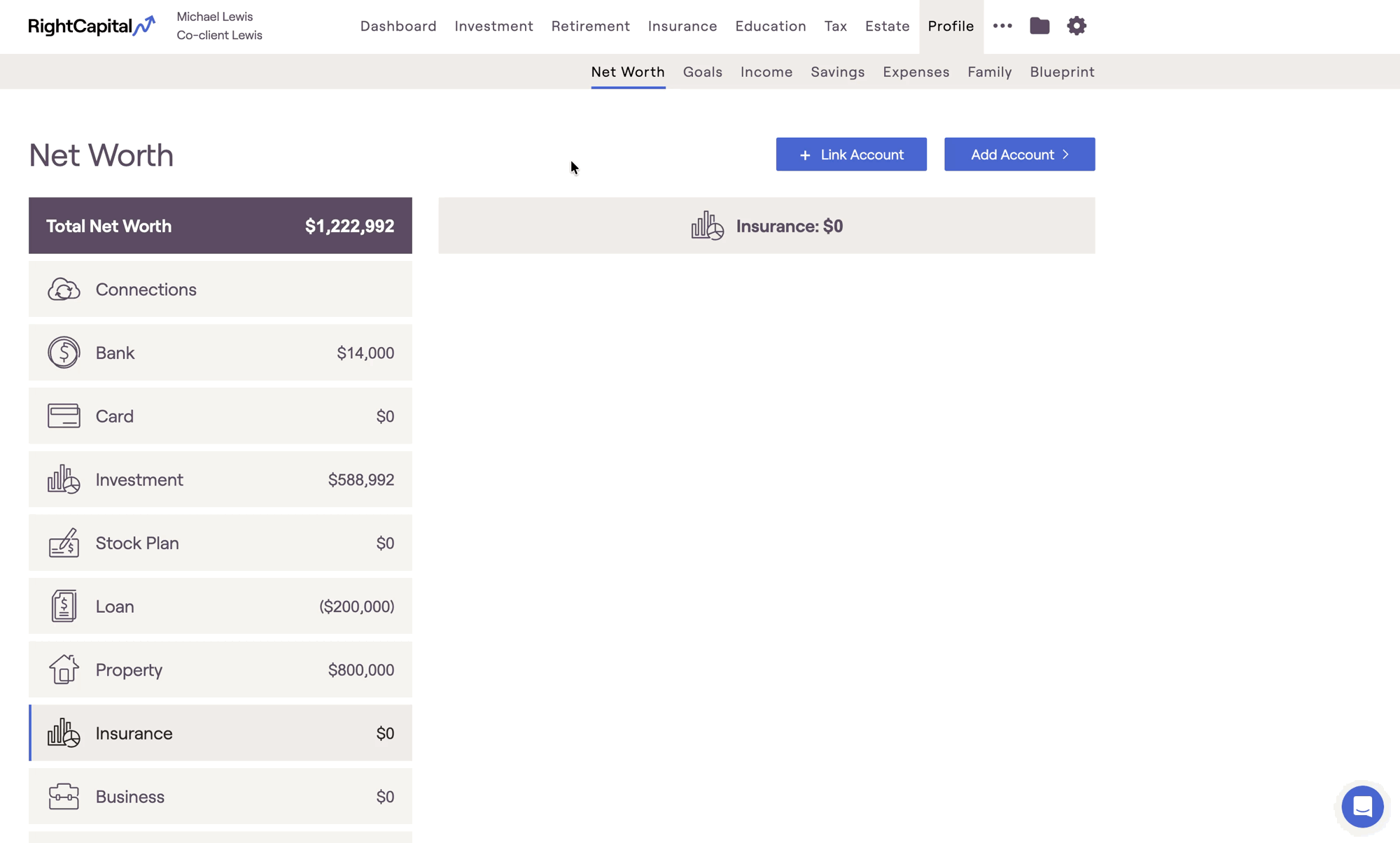 Existing Auto Insurance policies can be added via the Net Worth section of the Profile (or the Net Worth step of the initial data entry process), by selecting Add Account > Insurance > Auto: