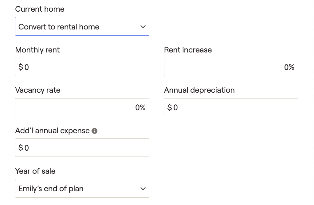 You can also convert the primary home to a vacation home or a rental home. If you convert to a rental home, you will be asked to enter information about new rental income, additional maintenance expenses, and depreciation. Additional annual maintenance expenses will be added to the annual maintenance value entered on the previous primary home.