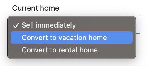 You can also specify what happens to the current primary home. The default option is 'Sell immediately', selling the existing property. Any mortgage and home equity associated with the property will be marked as paid, and the net proceeds will be added to the cash flow.
