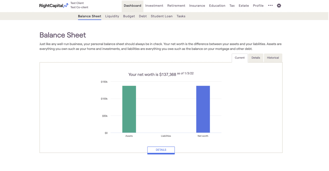 The advisor will be brought into the household within RightCapital, to the first screen shown (the ‘Balance Sheet’ screen). This is also the screen they will be brought to when they launch from a client each time after the initial import.