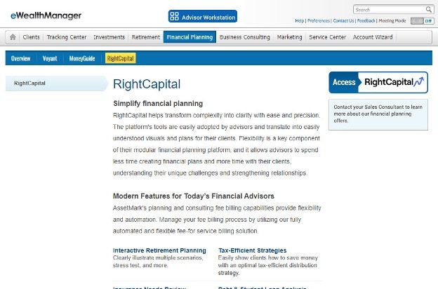 In AssetMark’s eWealthManager > Client Dashboard area advisors can click the button to ‘Access RightCapital’.