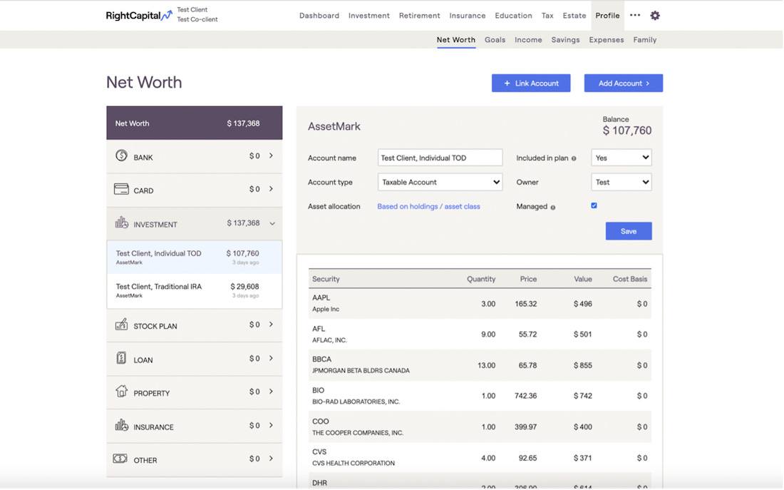 RightCapital pulls in household and investment account data and connects them with the client’s net worth. The positions will update Tuesday through Saturday morning with the previous night’s closing value.