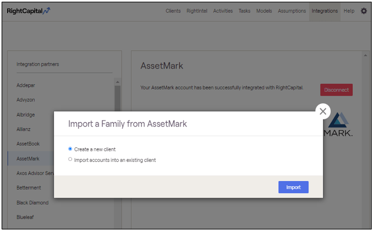 Please reach out to your contact at AssetMark, and mention that you are an existing RightCapital user and that you would like to set up an integration with AssetMark.