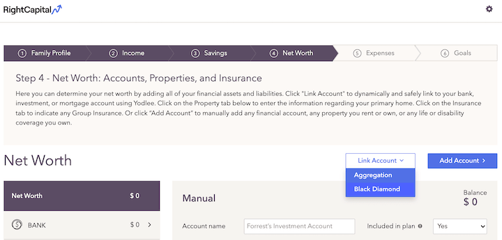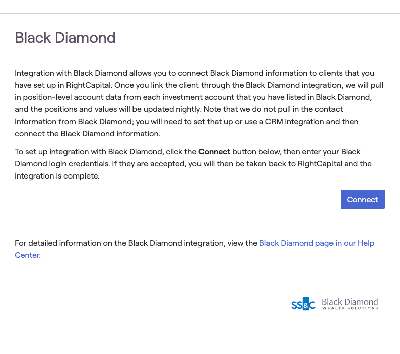 Integrating with Black Diamond connects Black Diamond information to clients you have set up in RightCapital. Once established, RightCapital pulls position-level account data from each account and connects them with the client's net worth. The positions and values will be updated Tuesday through Saturday evening with the previous night's closing value.