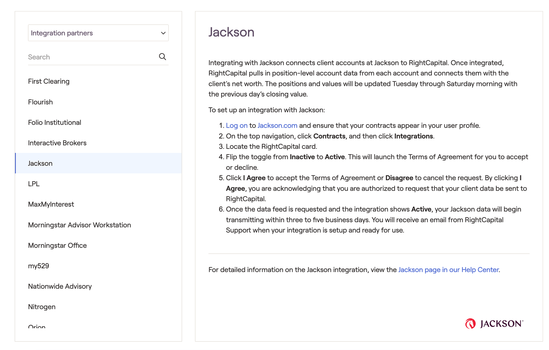 Integrating with Jackson connects client accounts at Jackson to RightCapital. Once integrated, RightCapital pulls in position-level account data from each account and connects them with the client's net worth. The positions and values will be updated Tuesday through Saturday morning with the previous day’s closing value.