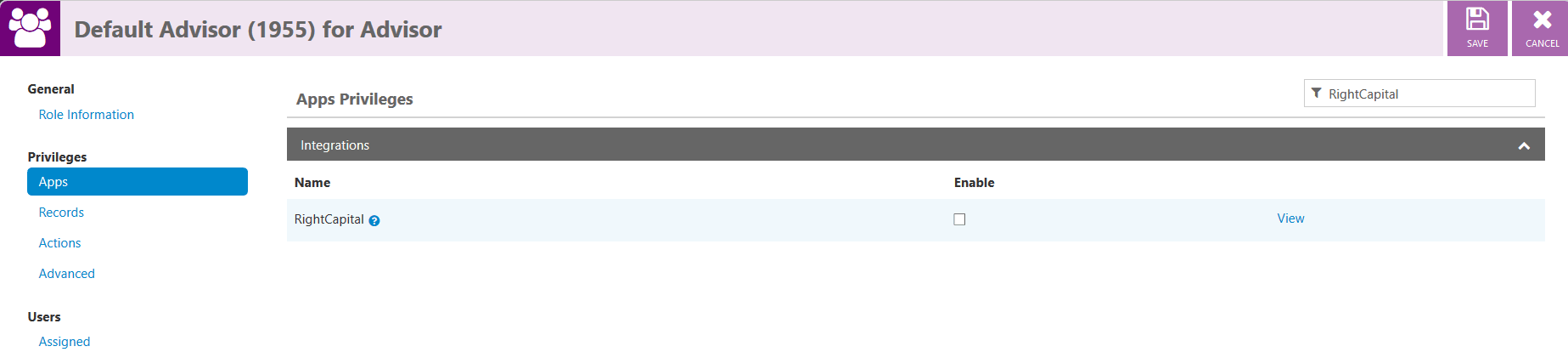 In order to set up SSO from Orion into RightCapital, first enable the RightCapital SSO in Orion by going to Orion Connect > Manage Users > Edit Role > Apps > Integrations > RightCapital. Click the Enable checkbox to enable the SSO capability.