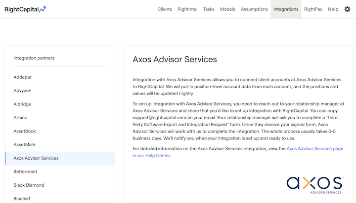 Integrating with AXOS Advisor Services connects client accounts at AXOS to RightCapital. RightCapital pulls in position-level account data from each account and connects them with the client's net worth. The positions and values will update Tuesday through Saturday evening with the previous night's closing value.