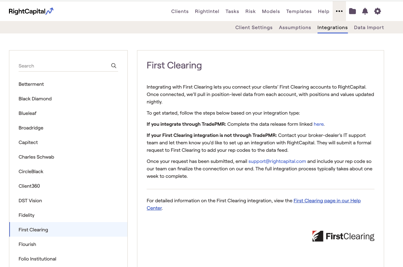 If your First Clearing integration is not through TradePMR: Contact your broker-dealer's IT support team and let them know you'd like to set up an integration with RightCapital. They will submit a formal request to First Clearing to add your rep codes to the data feed.