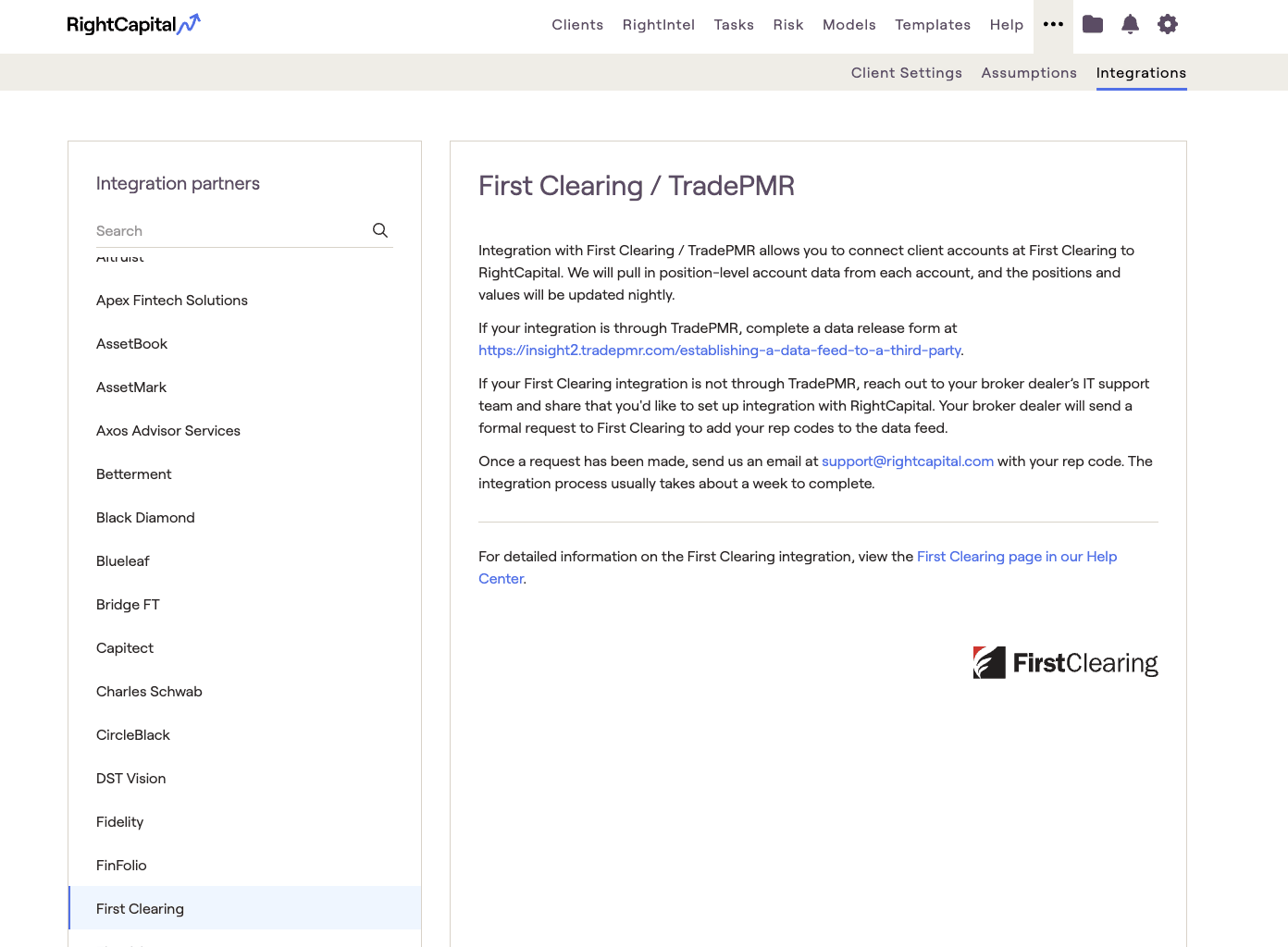 Integrating with First Clearing / TradePMR connects client accounts at First Clearing to RightCapital. Once integrated RightCapital pulls in position-level account data from each account and connects them with the client's net worth. The positions and values will be updated Tuesday through Saturday evening with the previous night's closing value.