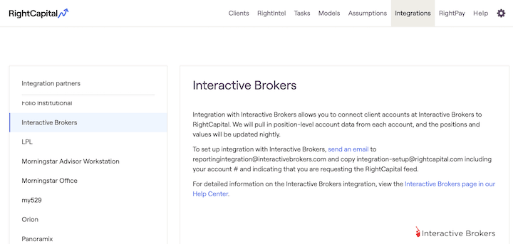 Integrating with Interactive Brokers connects client accounts at Interactive Brokers to RightCapital. Once integrated, RightCapital pulls in position-level account data from each account and connects them with the client's net worth. The positions and values will be updated Tuesday through Saturday evening with the previous night's closing value.