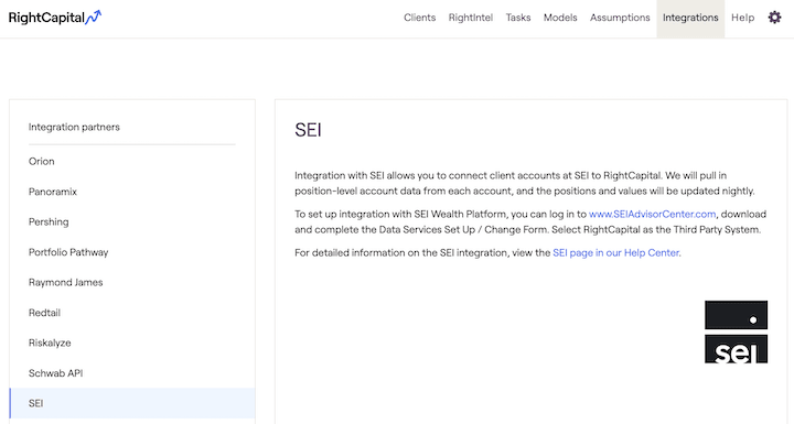 Integrating with SEI connects client accounts at SEI to RightCapital. One integrated, RightCapital pulls in position-level account data from each account and connects them with the client's net worth. The positions and values will be updated Tuesday through Saturday evening with the previous night's closing value.