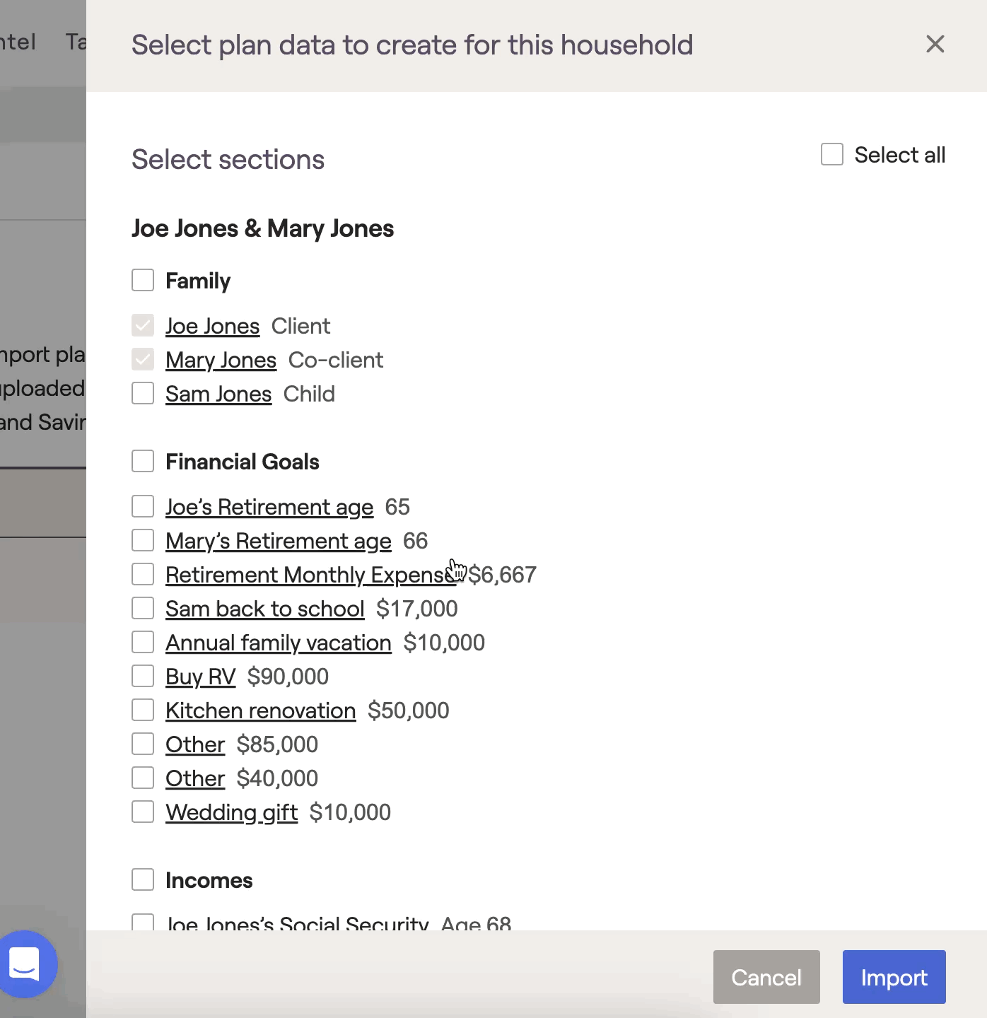 - Existing Household: Uploading to an existing household will simply add the items to the plan. It will not overwrite any personal info or items already within the plan.