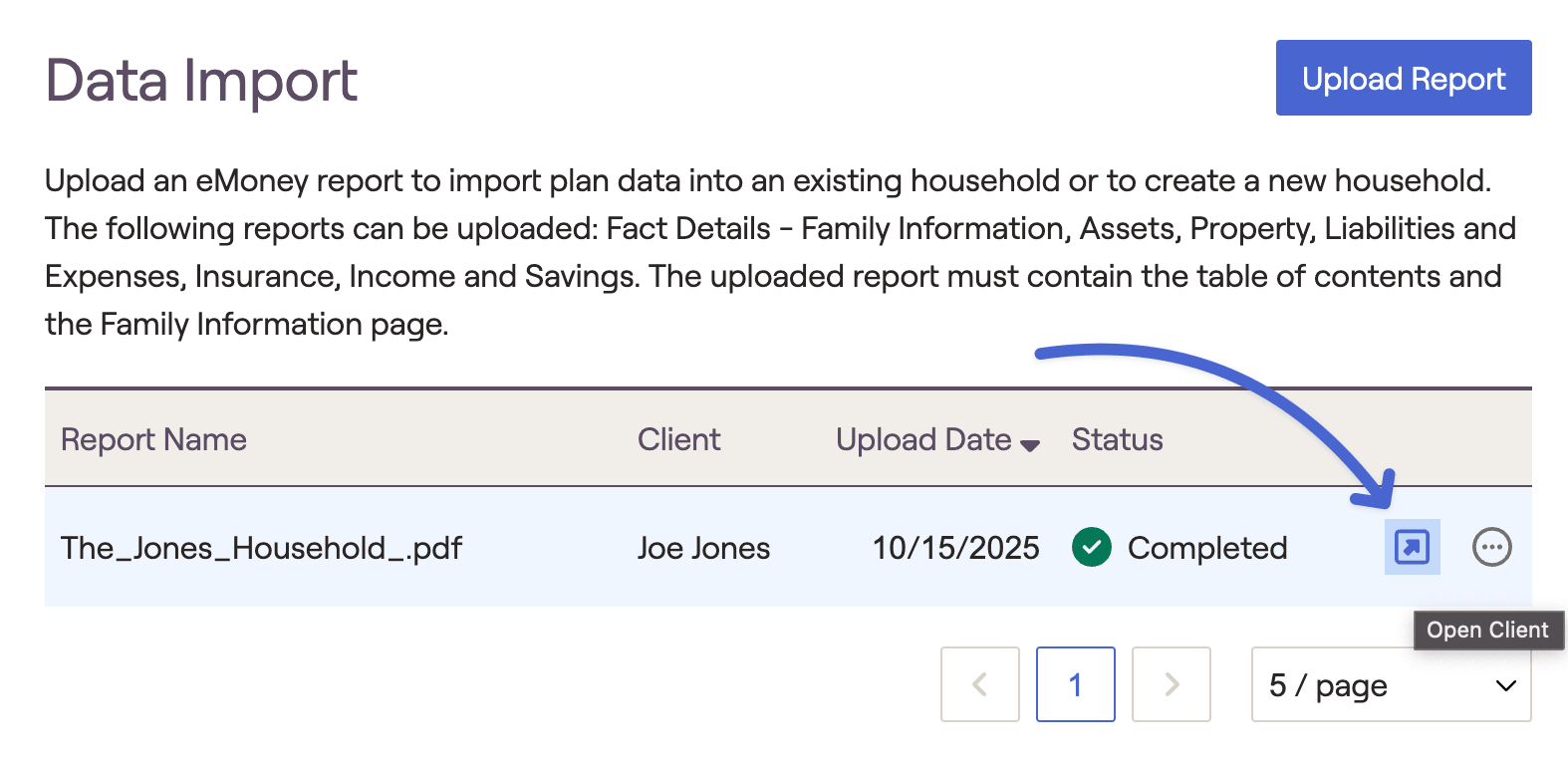 Once you've selected import, you can open the client plan and see the data that was transferred. You can also open the client plan from the data import screen by selecting this arrow option here: