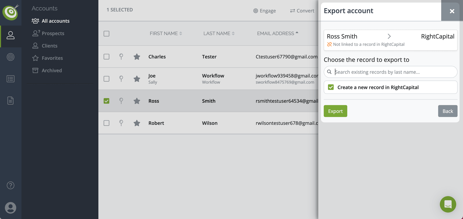 If the client is not already in RightCapital, you can create a new record on export, or if they do exist and are already connected to an existing account, it will push updates to the already existing record for the client vs. duplicating it. Once you've made your selection click on Export.