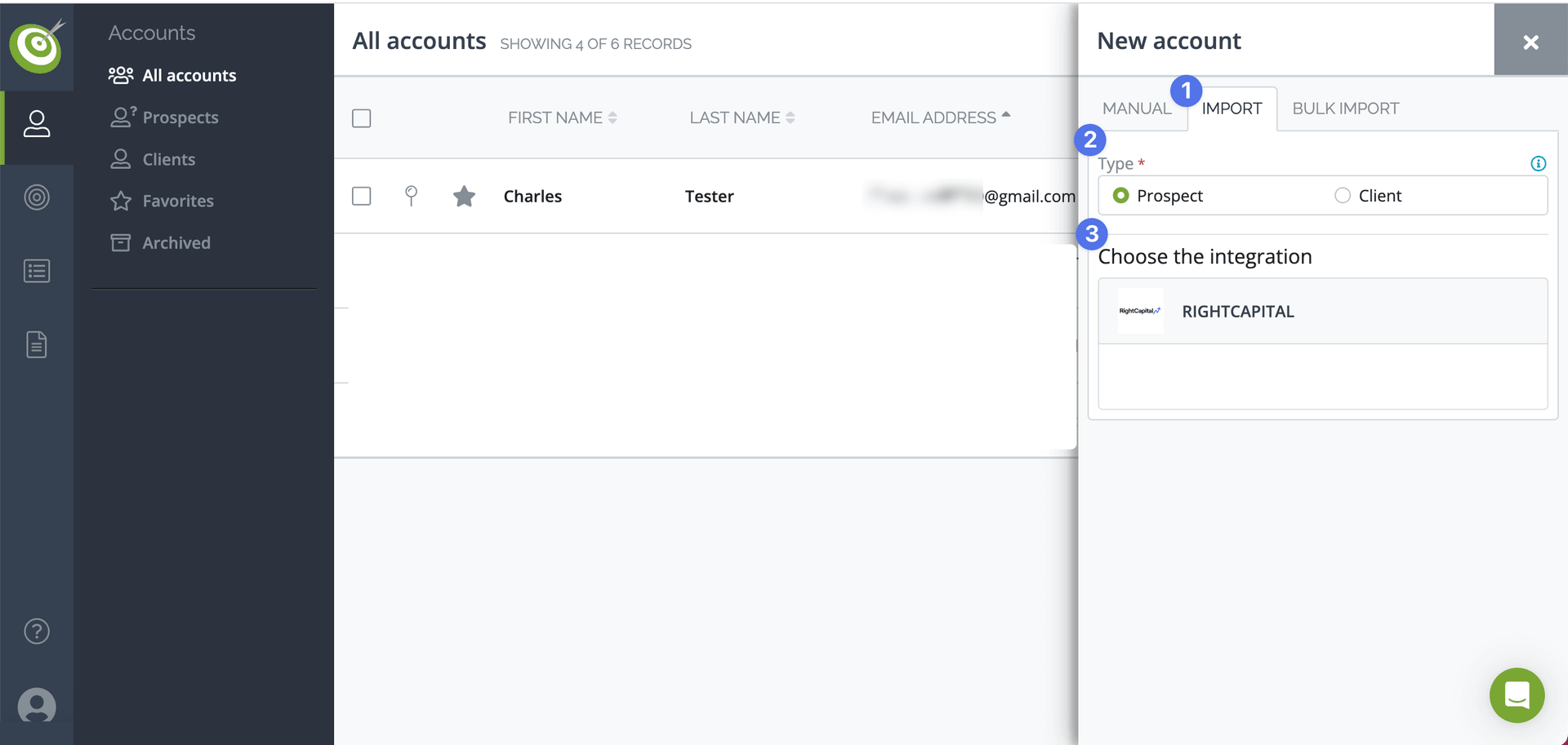 Click on the Import tab and choose Prospect or Client. Then select RightCapital from the list.