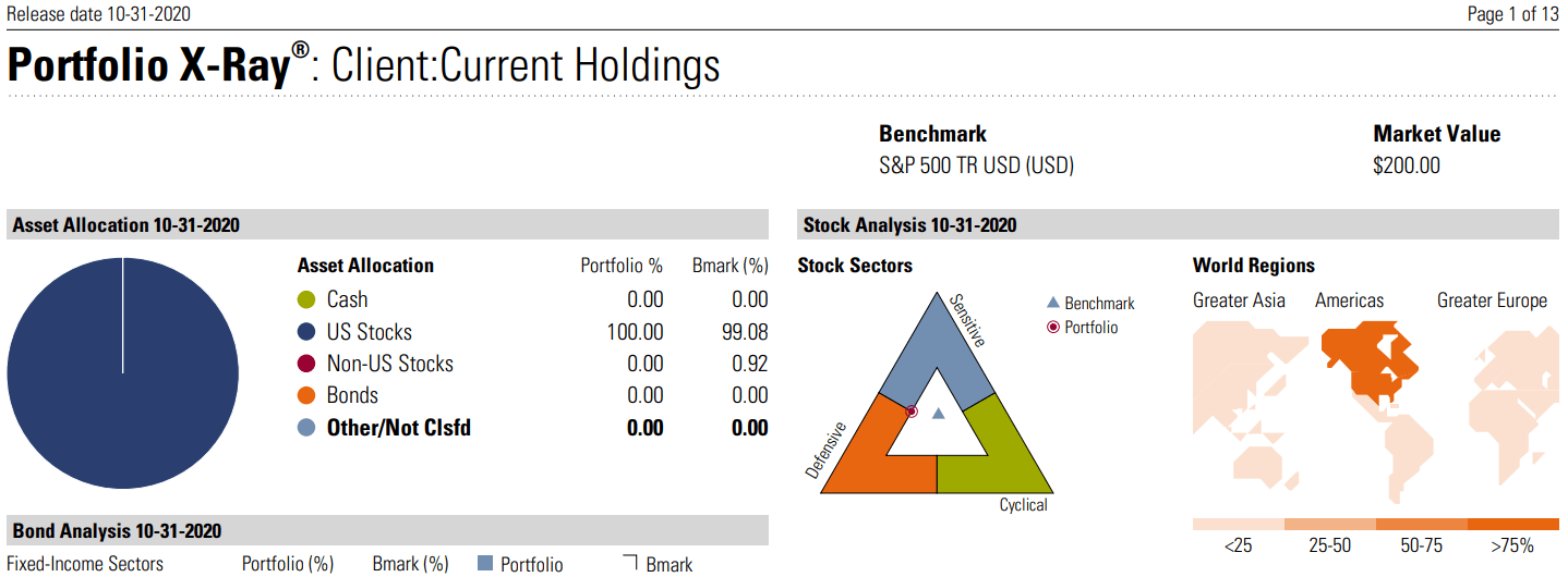 The portfolio x-ray report is the most straightforward way to communicate a portfolio’s overall investment strategy to your clients. It condenses vast amounts of investment information into a clear, concise summary that can be grasped at a glance.
