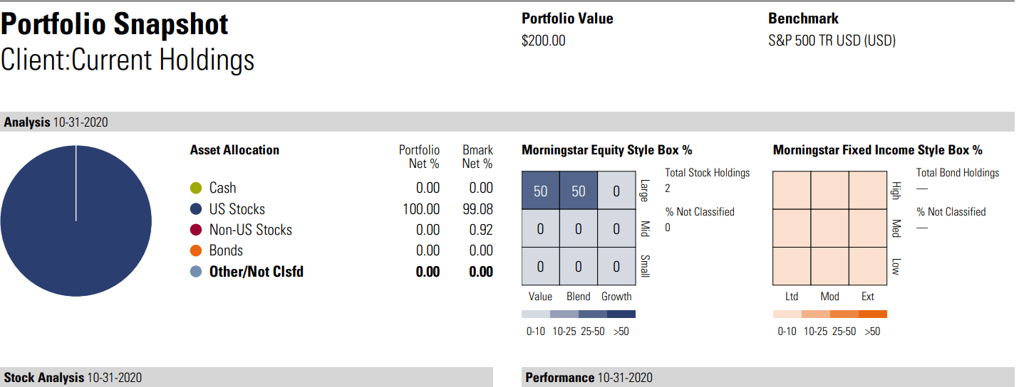 The portfolio snapshot report is the full offering of portfolio analytics. This report offers in-depth portfolio analysis including portfolio composition, investment style, sector weightings, regional exposure, performance and more. Advisors can choose to generate the portfolio snapshot and intersection within one combined report.