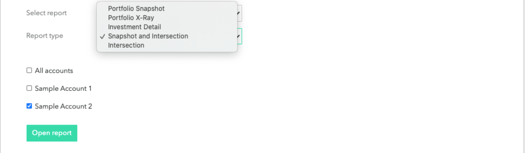 On the Report menu advisors will have the option to generate a portfolio snapshot report, stock intersection report, portfolio x-ray report, investment detail report or snapshot & intersection report using the client's holdings. These reports will display in a separate browser window.