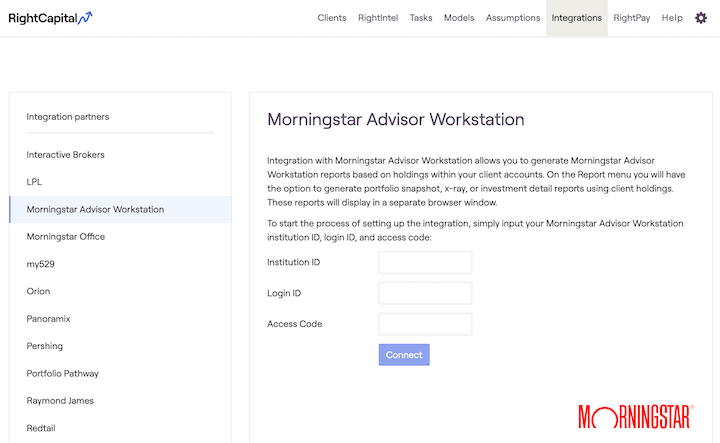 Navigate to Integrations tab then select Morningstar Advisor Workstation