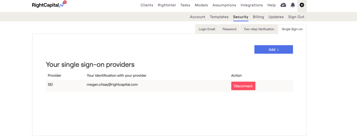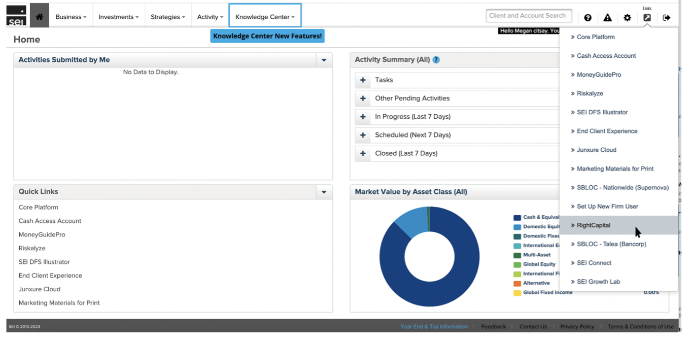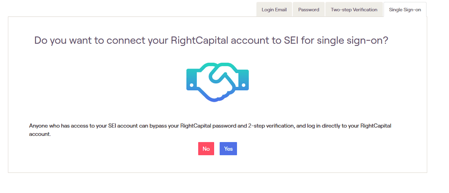 A Single Sign-on, commonly referred to as an SSO, is an authentication method that allows you to securely access multiple applications (SEI & RightCapital) with a single set of credentials. Once you have been authenticated by logging into SEI, you can securely access RightCapital software without re-entering your credentials. After your first successful SSO into RightCapital, you can SSO back to SEI anytime. This saves you time and creates efficiencies as you cycle between your financial technologies. For information about the SEI Integration, please click here.