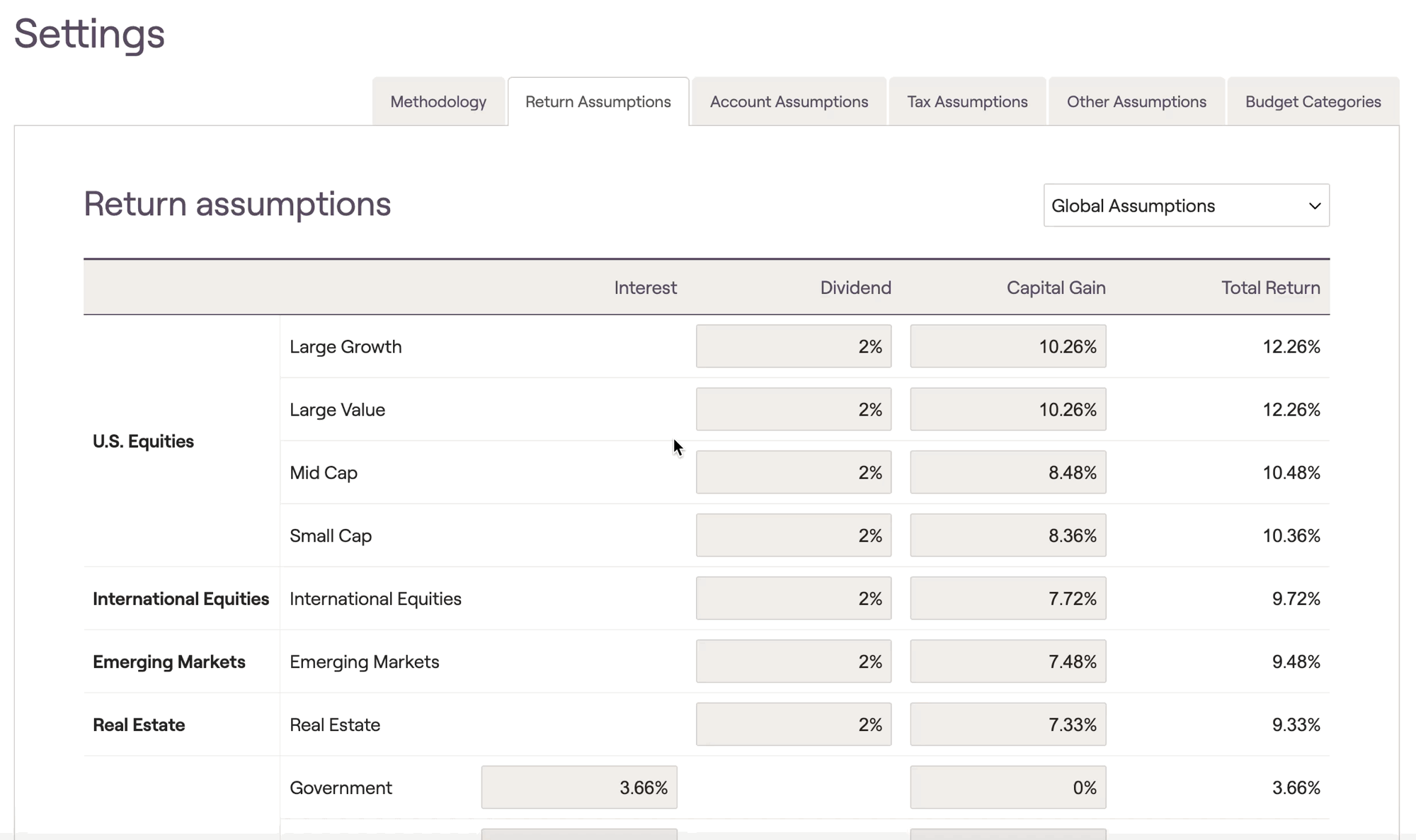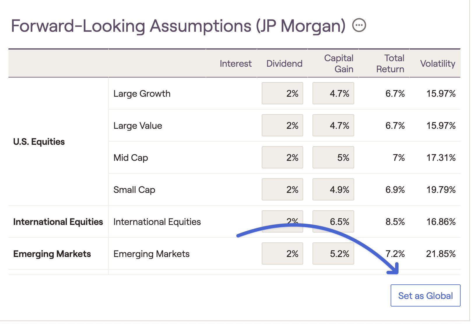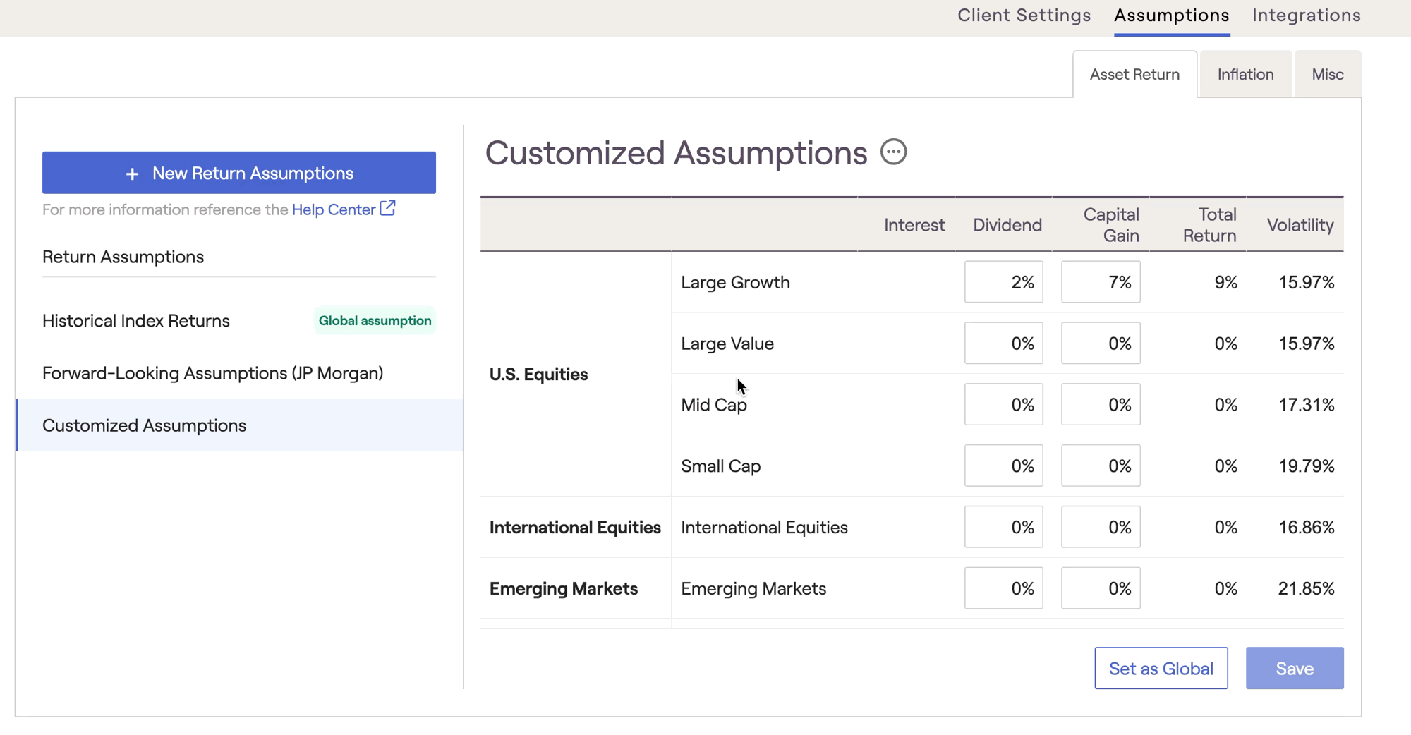 If your firm has opted to lock in a set of firm-wide return assumptions for all advisors in your organization, you will not have the ability to adjust global or client-specific return assumptions. If this is the case, any questions or requests to change return assumptions should be directed to the administrator of your firm.