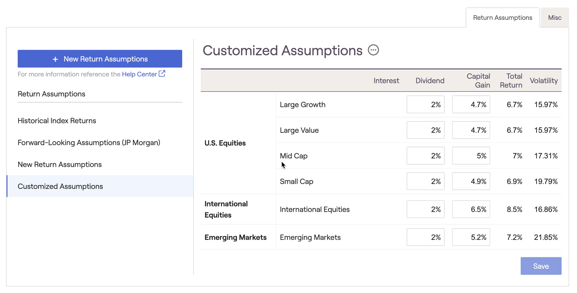 By adding a return assumption template, you can enter the interest, dividend and capital gain percentages for each asset class. This option provides the most flexibility, allowing you to manually customize your return percentages.