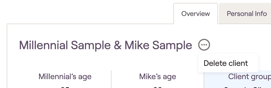 If you wish to delete the sample plans from your client list, you can do so by selecting the three dot icon next to the sample client name and then select "delete":