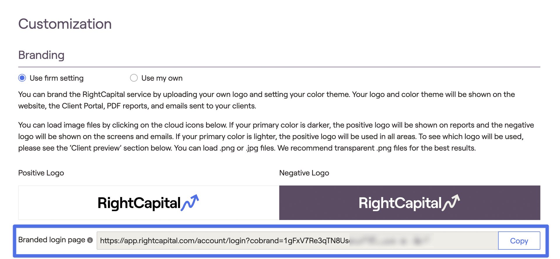 The Branded login URL is a link that clients can use to login to their RightCapital account after it has been created. The login screen will display your logo and color theme. The Branded Login URL can be sent to clients after they have created their RightCapital login.