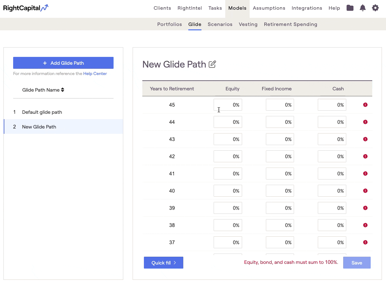 When creating a custom glide path, the Quick Fill button allows advisors to populate or clear information much more easily.