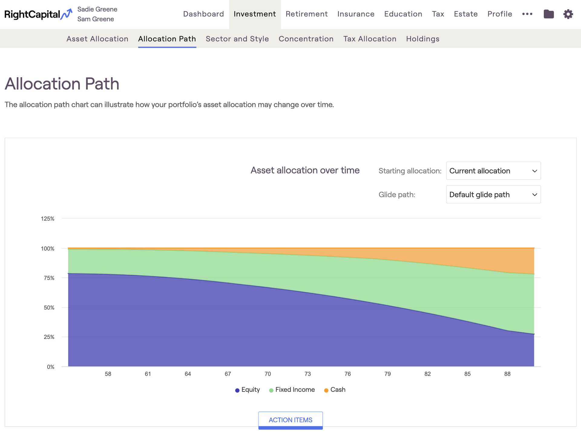 If '1-year grading' is selected, the client's allocation will automatically shift to the glide path allocation in year 2 of the projection. For any other grading schedule, the client's allocation will shift proportionally over the duration of the grading schedule, from the current allocation to the glide path allocation indicated.