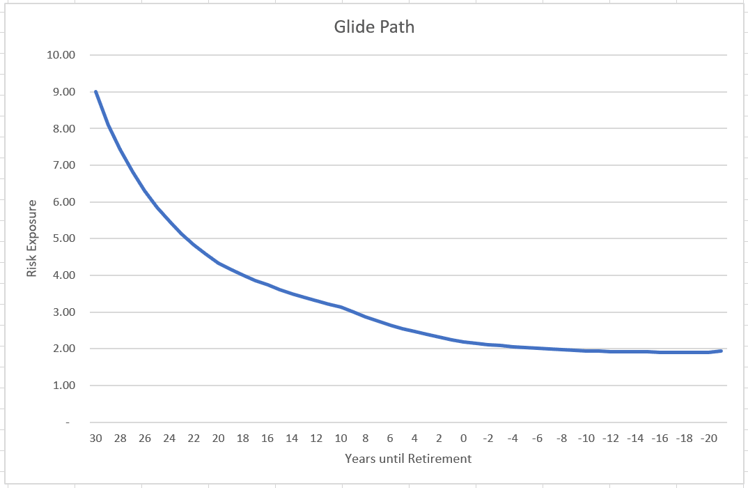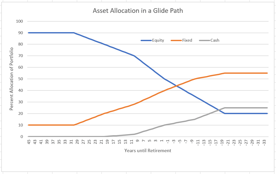 Glide paths are used to transition invested assets from high exposure to lower exposure allocations over time. Specifically, glide paths identify the percentage of a portfolio invested in equity, fixed income, and cash asset classes at a given year on the path. This enables you, as their advisor, to have a guide to transitioning a client's investment portfolio from more aggressive to more conservative, over time.
