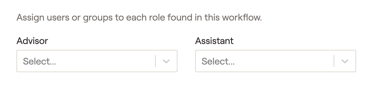 Assign users or groups to each role found in this workflow: Select one or more people or groups for each role in the workflow. Roles within a workflow can include 'Advisor' and/or 'Assistant'. Individual tasks within a workflow that are assigned to either the 'Advisor' or 'Assistant' roles will be automatically assigned to the people or groups you select for each role. Multiple people or groups can be selected by individually clicking them from the dropdown.