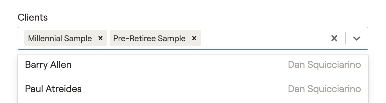 Clients: Select one or more client households to apply this workflow to. Multiple households can be selected by individually clicking them from the dropdown.