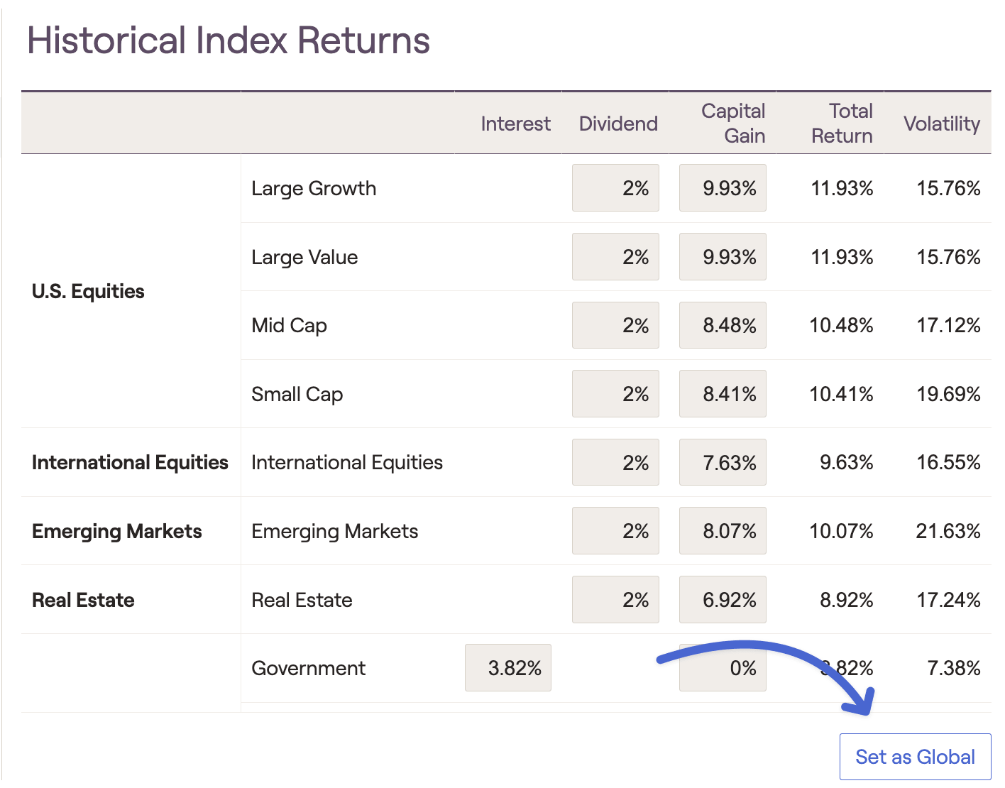 If your firm has opted to lock in a set of firm-wide return assumptions for all advisors in your organization, you will not have the ability to adjust global or client-specific return assumptions. If this is the case, any questions or requests to change return assumptions should be directed to the administrator of your firm.
