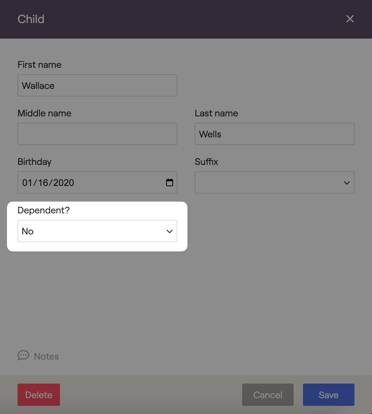 We can specify who claims the dependent in the plan. Navigate to the Profile > Family > Child card and select the dependent from the dropdown.