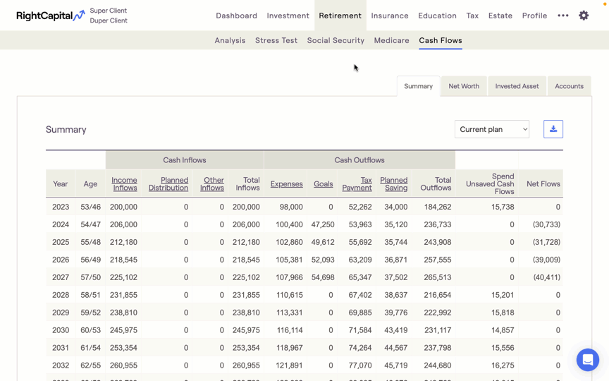 When viewing the Cash Flow summary page, click on the Tax Payment header to see a detailed overview of the client and co-client tax payments. RightCapital will individually show the Federal, State, and FICA with this tax status.