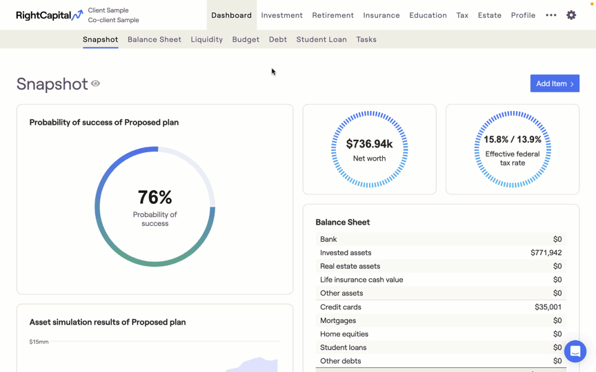 In the Snapshot module, the Tax Estimate metrics will reflect the effective federal and the total effective tax rate for the client and the co-client.