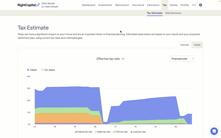 Navigate to the Tax Estimate > Details tab to see a breakdown of the detailed tax projections for the client and co-client.