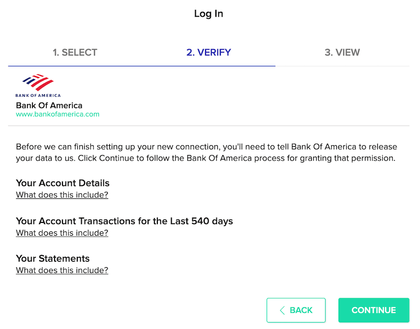 After selecting a financial institution, the user is presented with an information screen. This gives transparency to the user about what data will be retrieved with their permission. If the user agrees to share their information they can select continue.
