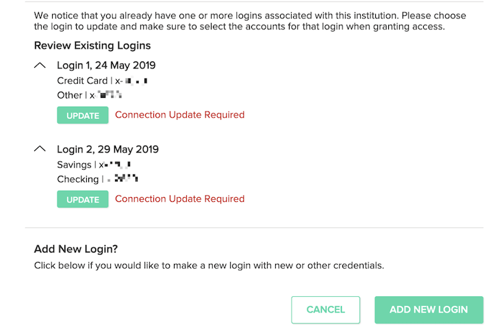 When the user selects the site, Yodlee will display a screen that informs the user that they need to update an existing connection. Following the update prompt will take the user through the same authentication flow we describe for linking the new account.