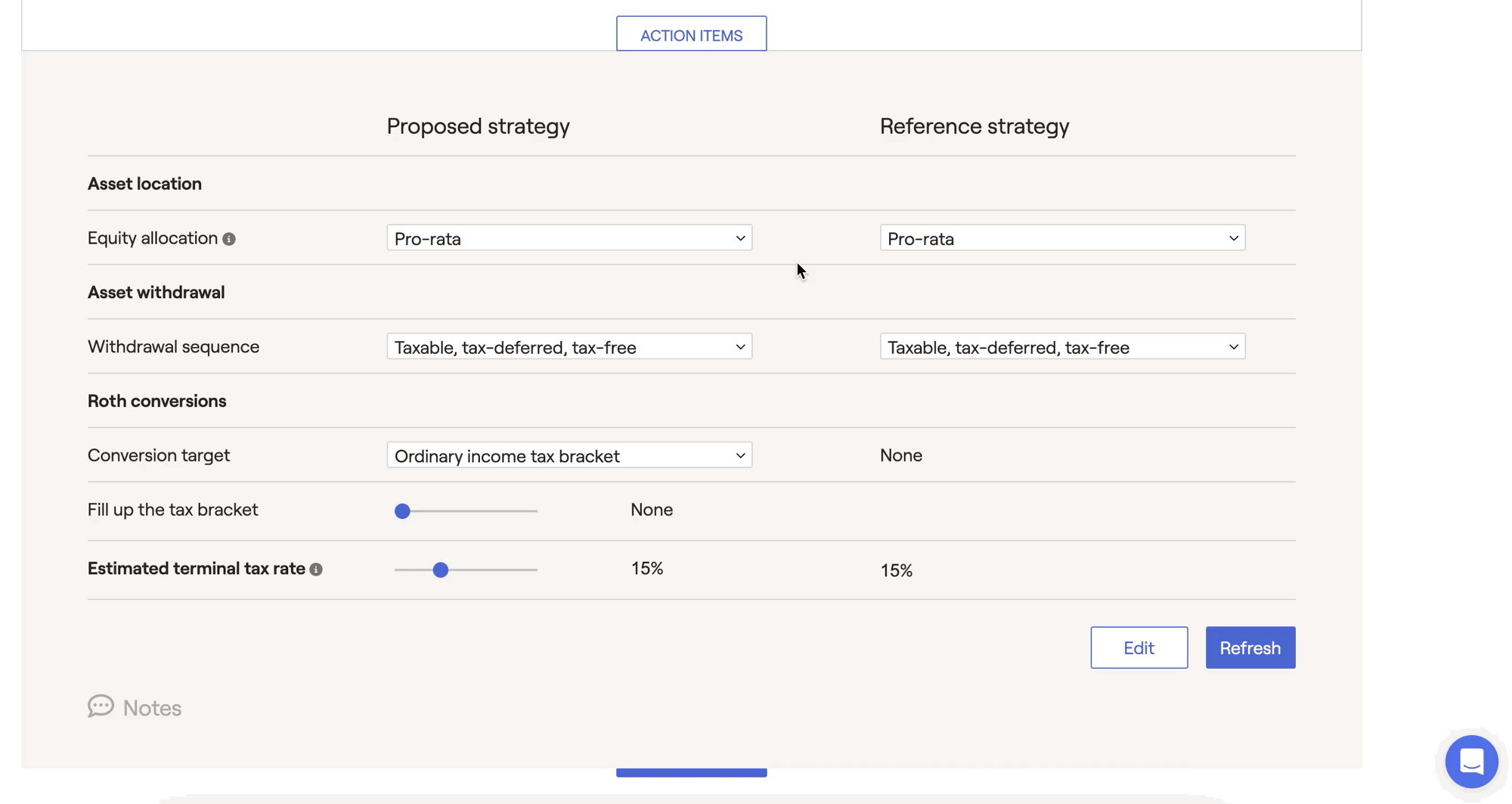 - Use the Action Items to model Roth conversions, shift a client's Asset location, and alter their Withdrawal sequence.