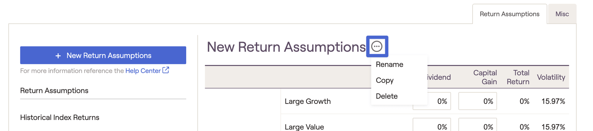 To make a custom return scenario, you can select the "+ Add Customized" option in the top right of the screen. Here, you can build out the custom return preset. You can also rename, copy, or delete the custom assumptions by selecting the three dot icon here: