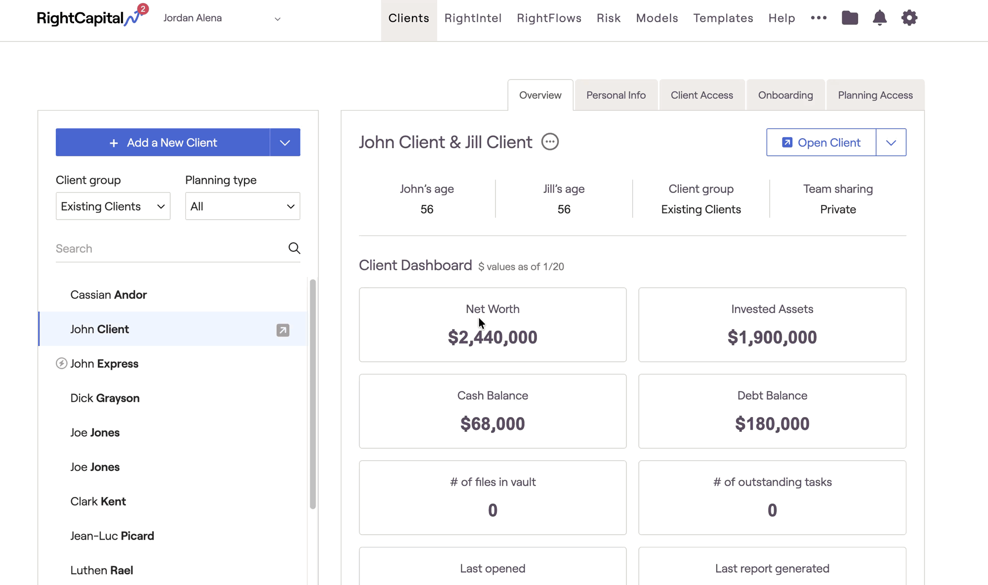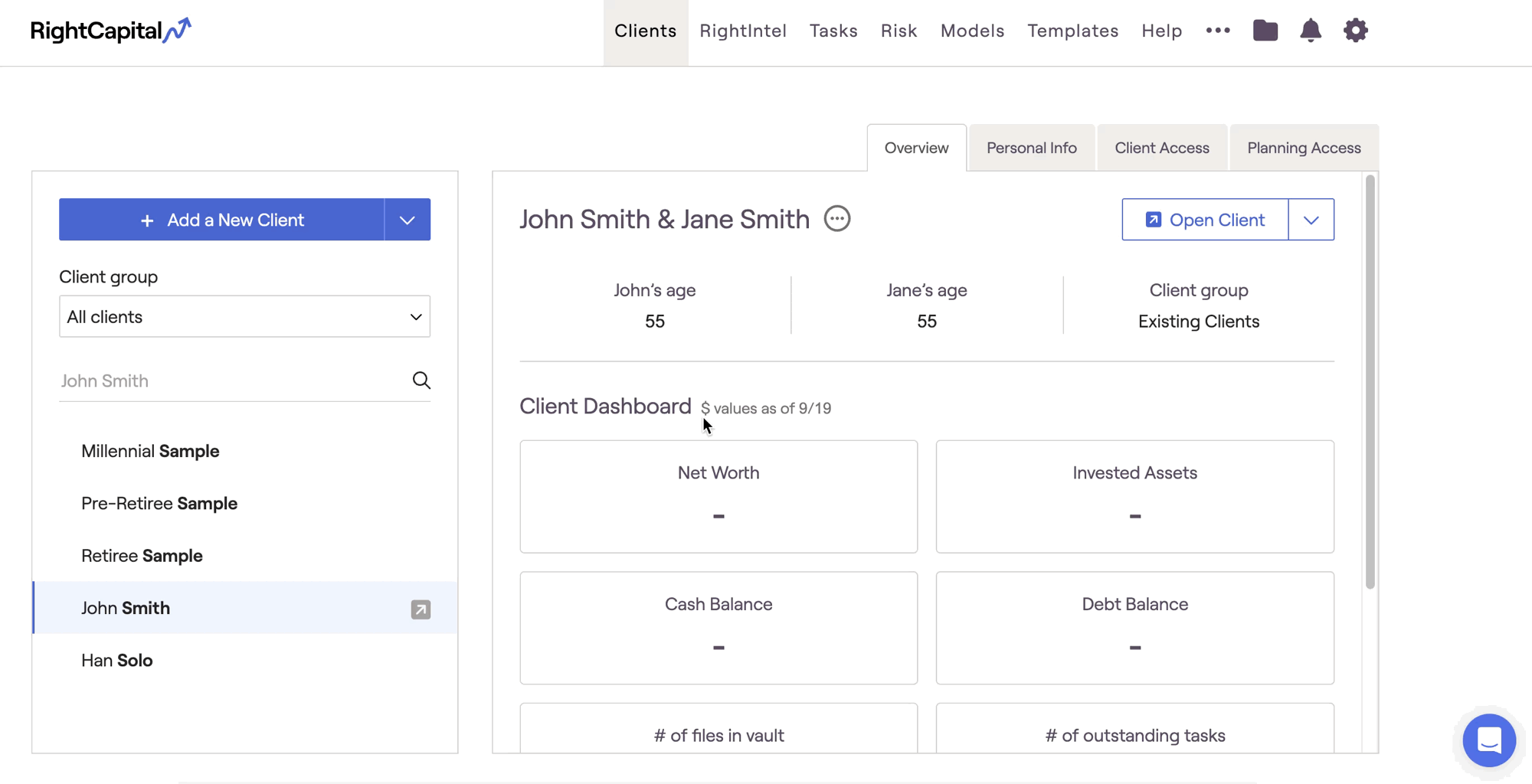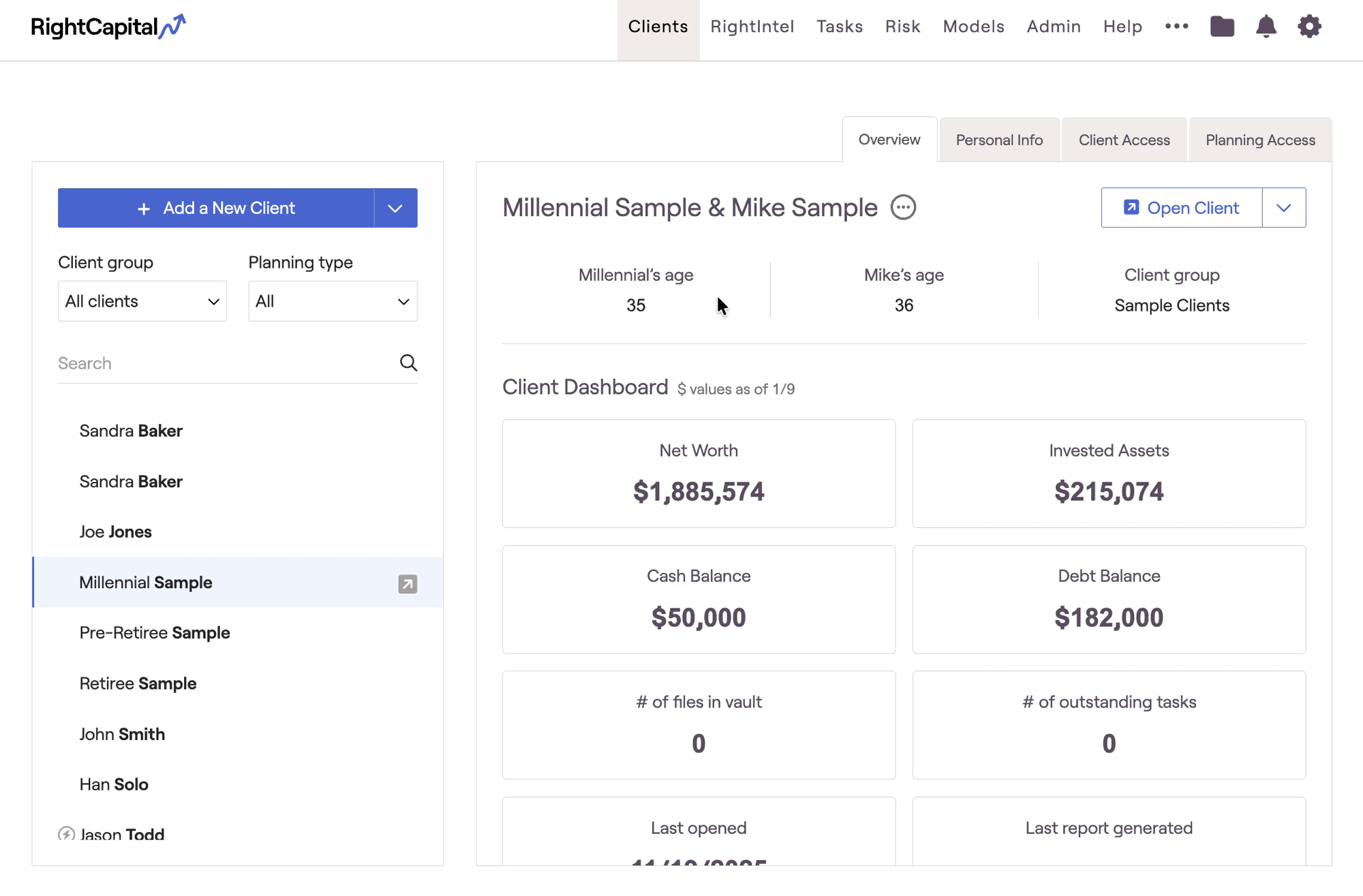 Your client list can be found on the left side of the Advisor Portal > Clients tab. This area provides insight into your entire book of business within RightCapital. The client list lets you search for individual client plans and view specific groups from the dropdown menu. Households will be listed alphabetically based on the client's last name: