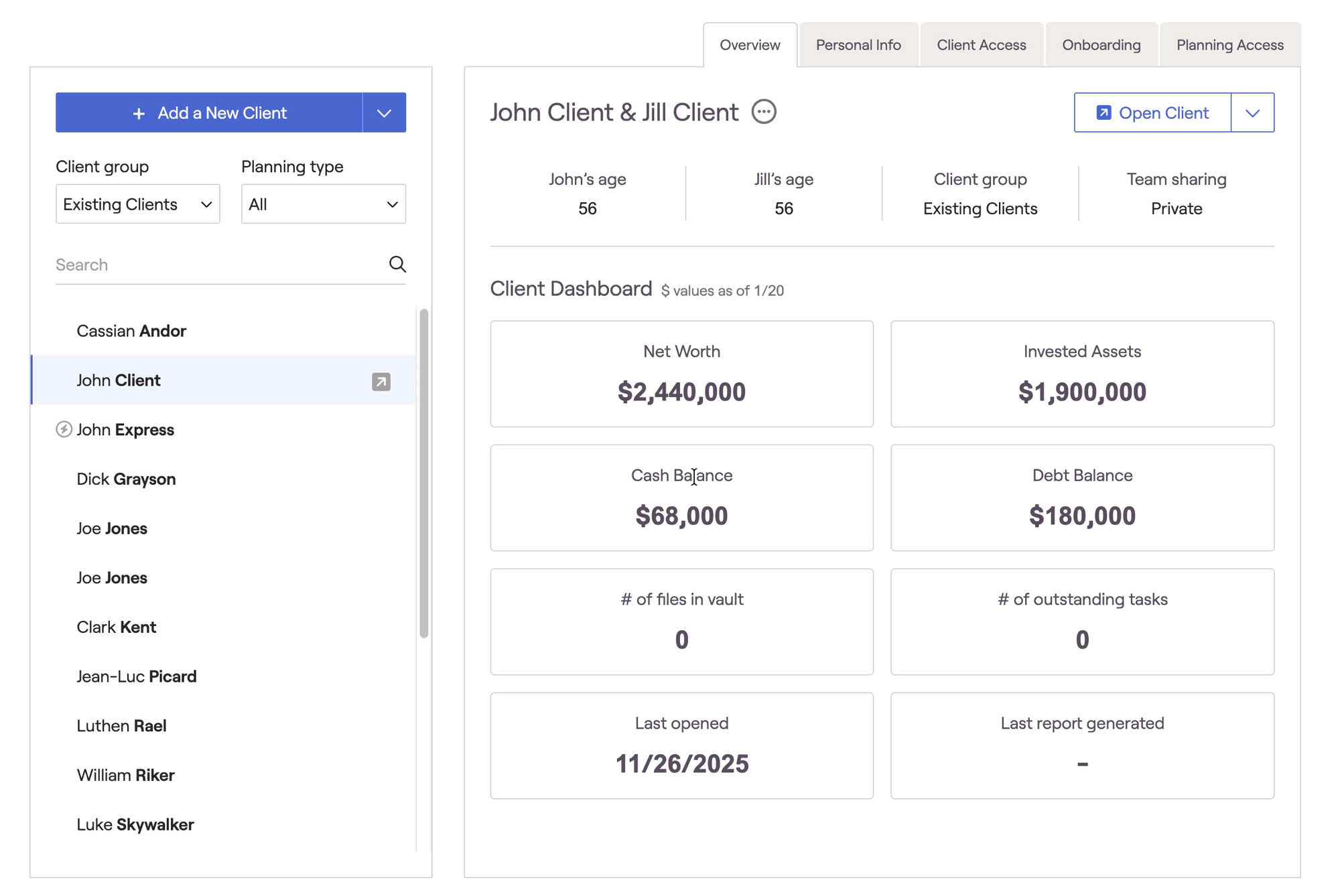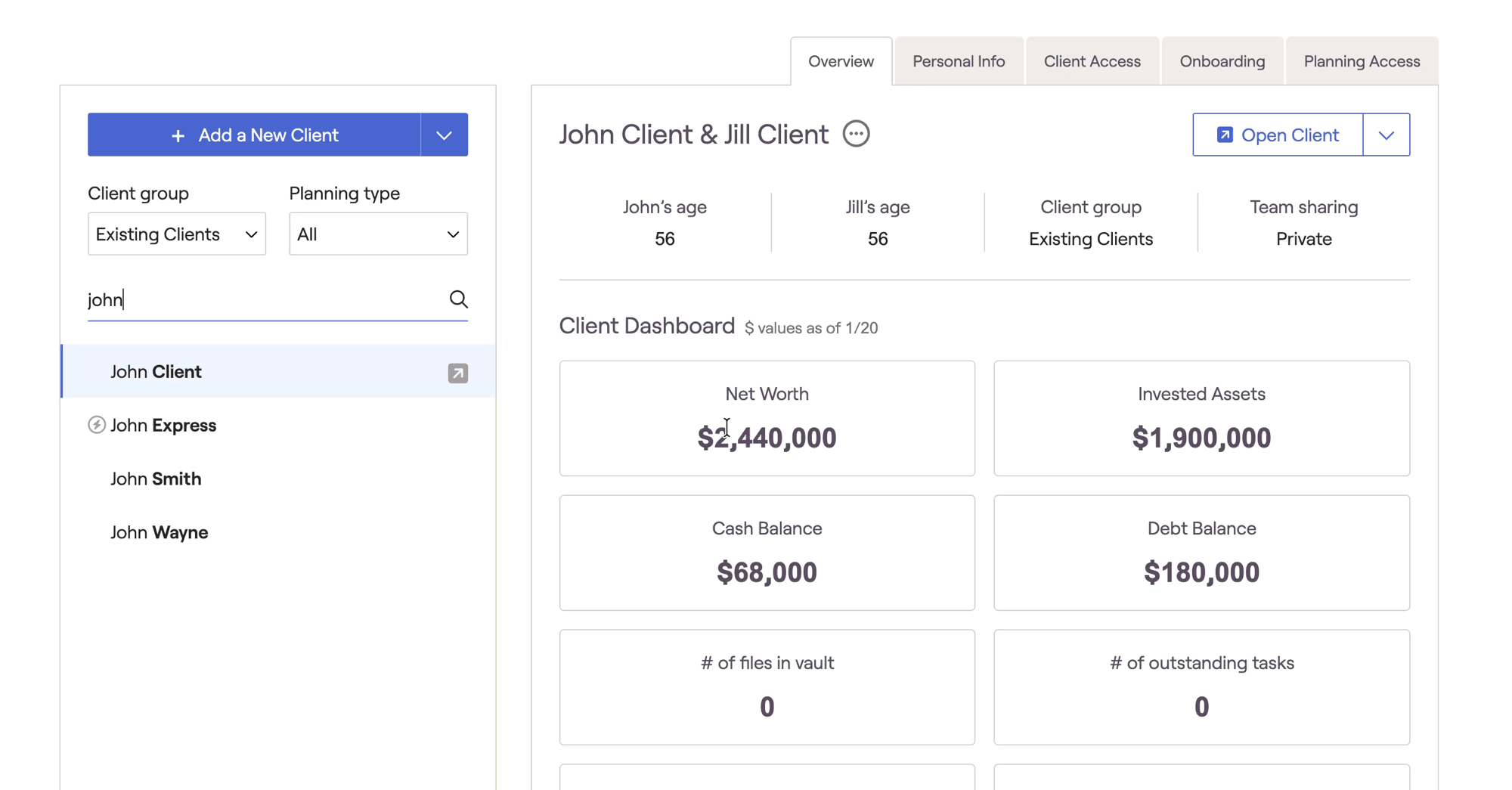 New client plans can be created by clicking the '+ Add a New Client' button at the top of the client list. Client plans that have already been created can be opened by clicking on a particular client in the client list, and then clicking the 'Open Client' button in the upper right of the page (or the arrow icon next to the client's name):